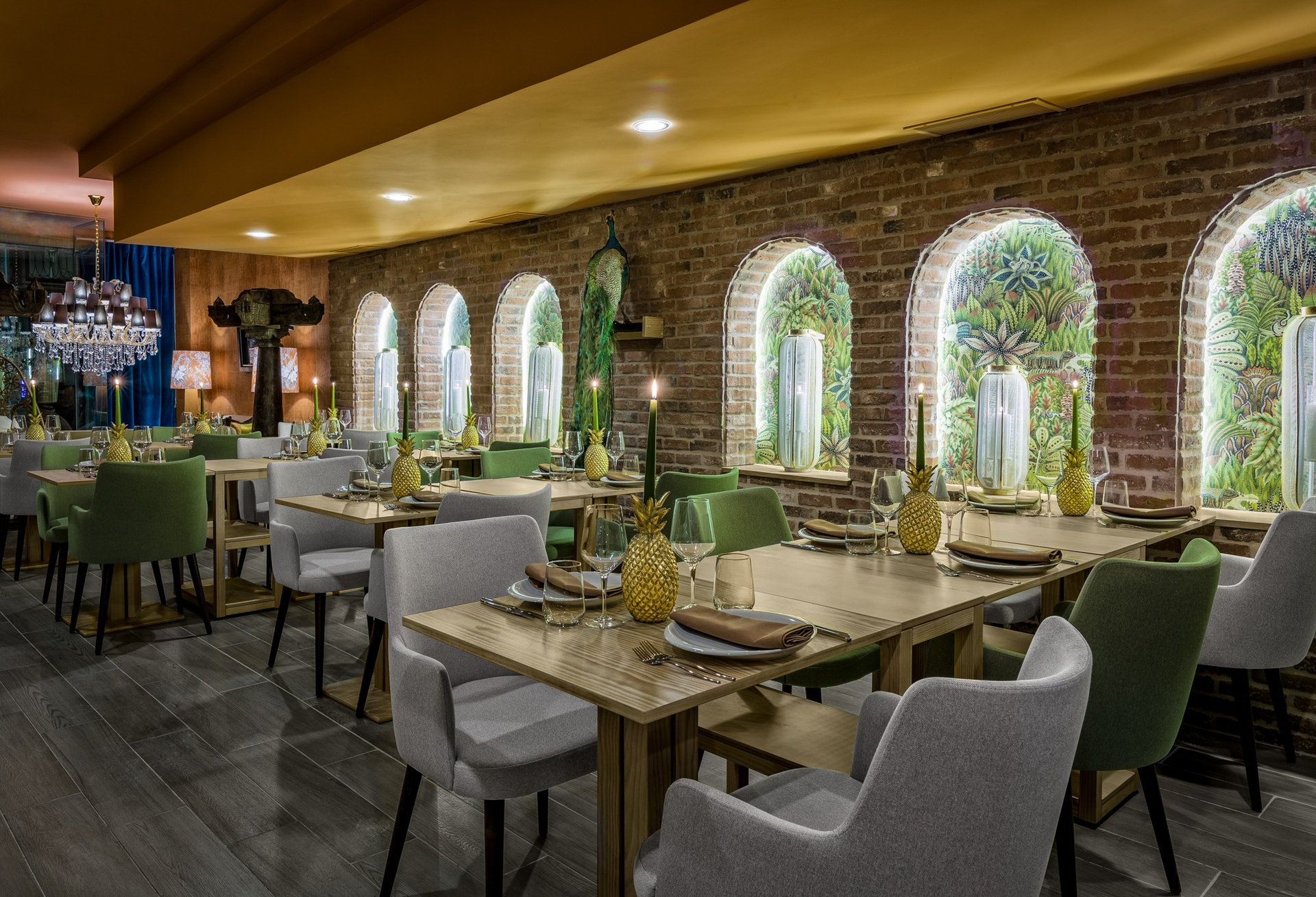 A iluminação assume um papel central no projeto. Luminárias de grande impacto visual, como os lustres em cristal, convivem harmoniosamente com pontos de luz indireta, criando jogos de sombras e reflexos que enriquecem a experiência do cliente. Elementos decorativos inspirados na natureza, como arranjos florais exuberantes e detalhes botânicos, trazem leveza e sofisticação ao espaço.
